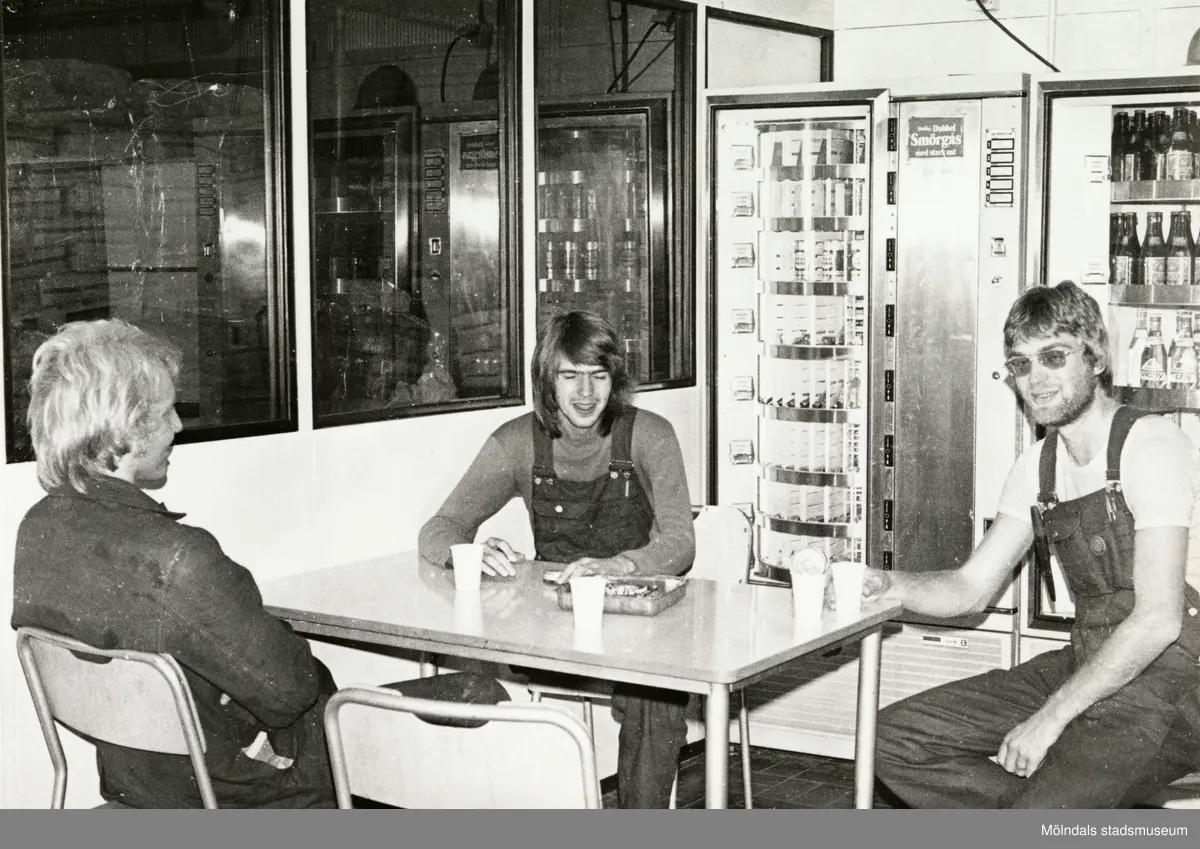 Tre män fikar i lunchrummet på fabriken Soab Berol Kemi i Mölndals Kvarnby, år 1977.