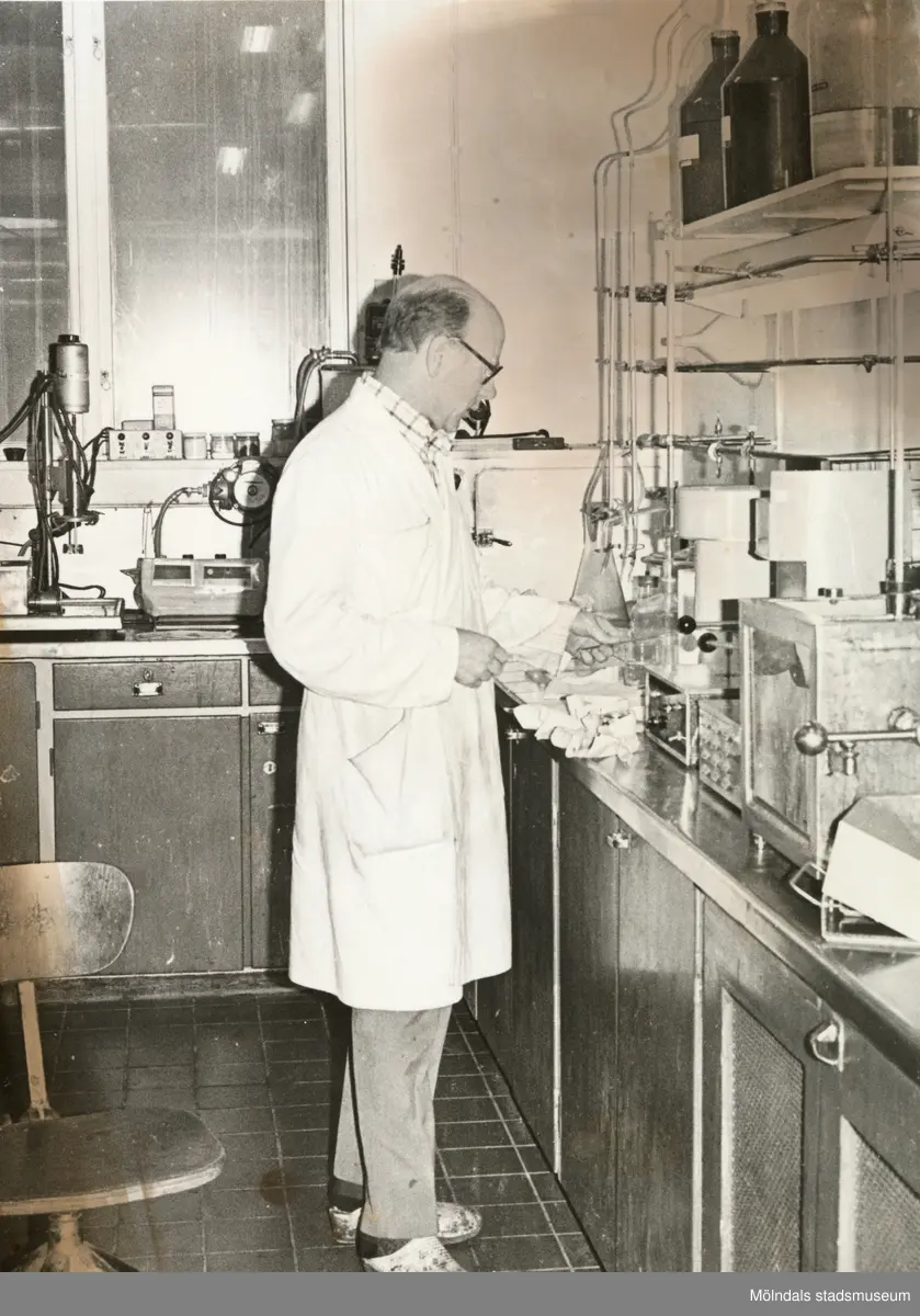 En man i arbete i laboratorium på fabriken Soab Berol Kemi i Mölndals Kvarnby, år 1977.