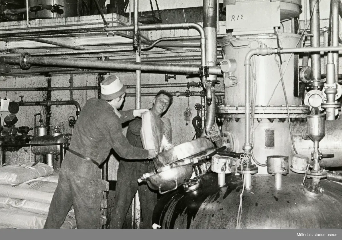 Två män i arbete på fabriken Soab Berol Kemi i Mölndals Kvarnby, år 1977.