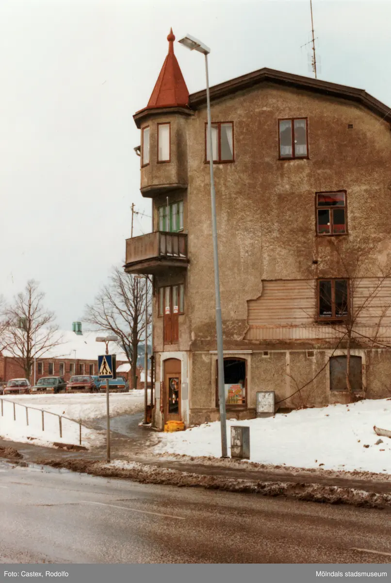 Trädgårdsgatan 4 i Trädgården, Mölndal, i januari 1984. Vy från Kvarnbygatan. I gatuplanet ligger Annas affär.
