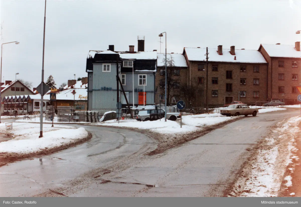 Trafik vid järnhandlarerondellen i Mölndals centrum i januari 1984. Joel Jacobsons järnhandel med adress Frölundagatan 30. I bakgrunden till vänster ses även Sahlins terrass.