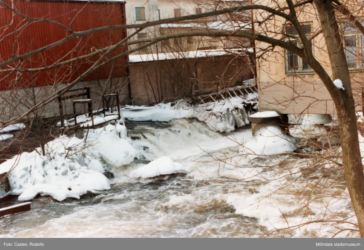 Mölndals Kvarnby i januari 1984. Industribebyggelse vid Mölndalsfallen. Till höger gaveln till byggnaden "Strumpan". Vy från Rackarebron.