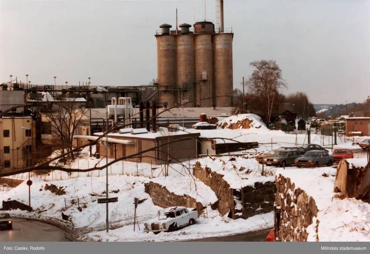 Mölndals Kvarnby i januari 1984. Vy från Kråkan mot industribyggnader tillhörande Soab.