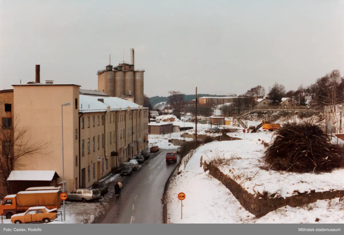 Mölndals Kvarnby i januari 1984. Till vänster byggnaden "Strumpan". Till höger hus i Enerbacken samt gångbro över järnvägen. I bakgrunden Soabs silobyggnad.