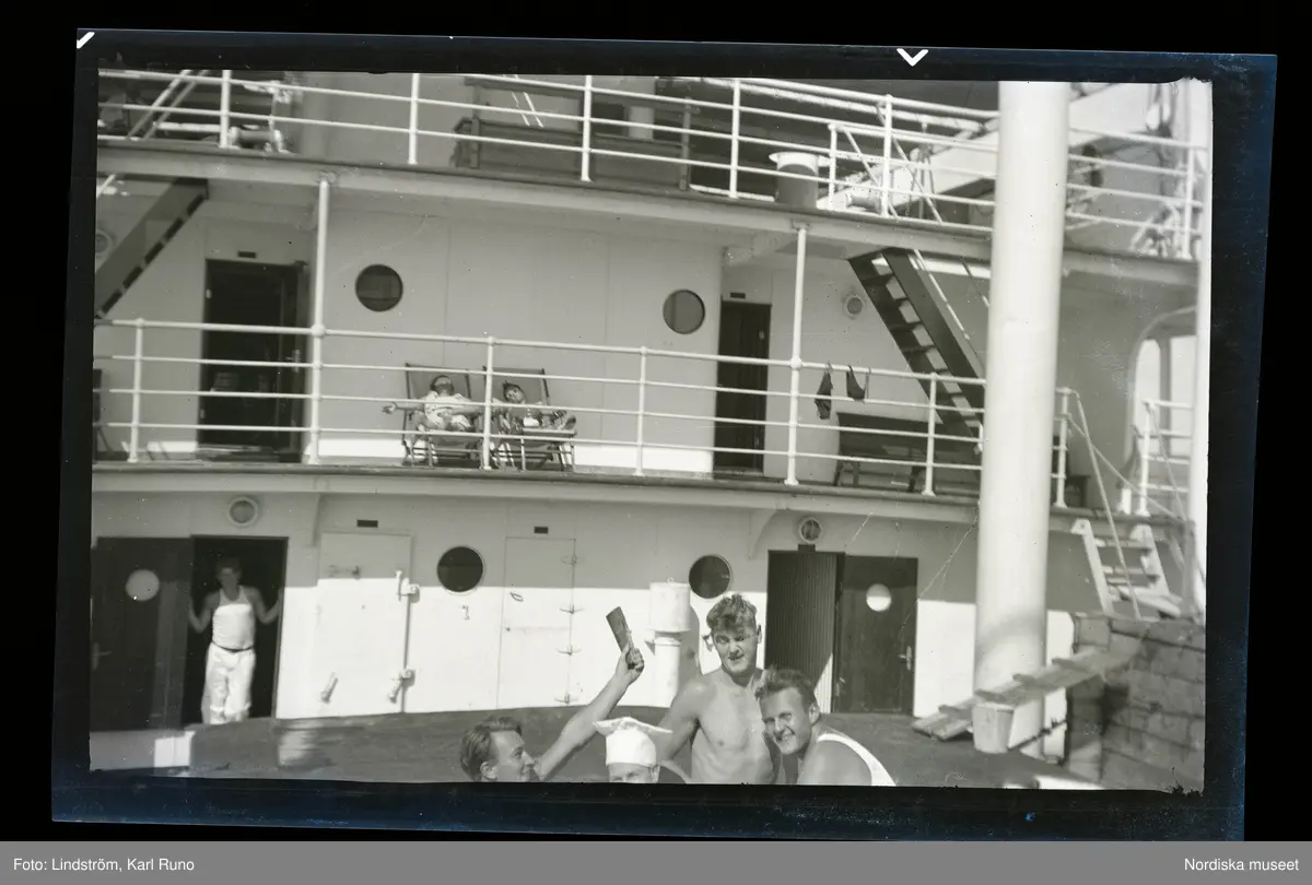 Besättningsmän vilar och umgås på däck.
