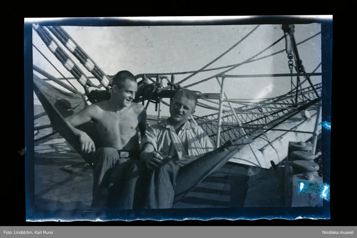 Två unga besättningsmän sitter i en hängmatta på ett fartyg.