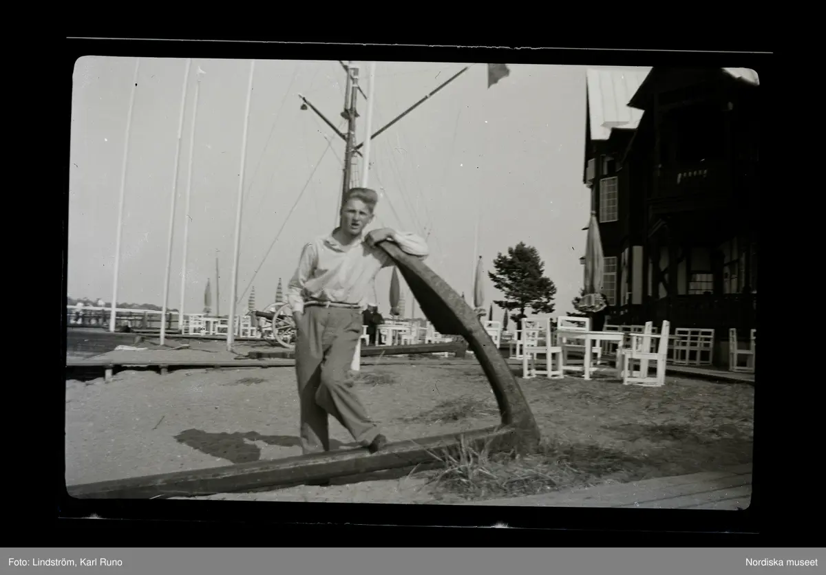 En ung man poserar vid ett ankare på land.