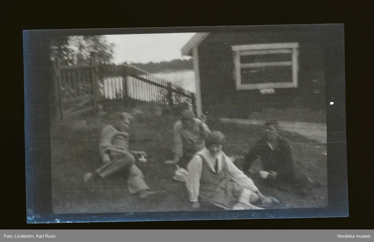 Ett sällskap av två män och två kvinnor sitter på marken i en trädgård och dricker kaffe.