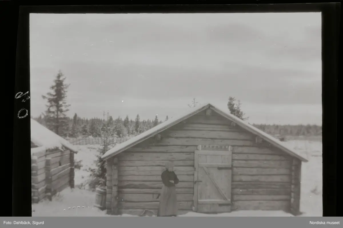 Fotografens anteckning: Dito gård (Karl Anton Holmbergs gård) "sommarfähus" + fru J. H. (Josefina Holmström) Öfver dörren en fartygsspillra med bokst. (S A O/H A N K), bergades för minst 20 år sedan på Holmön.