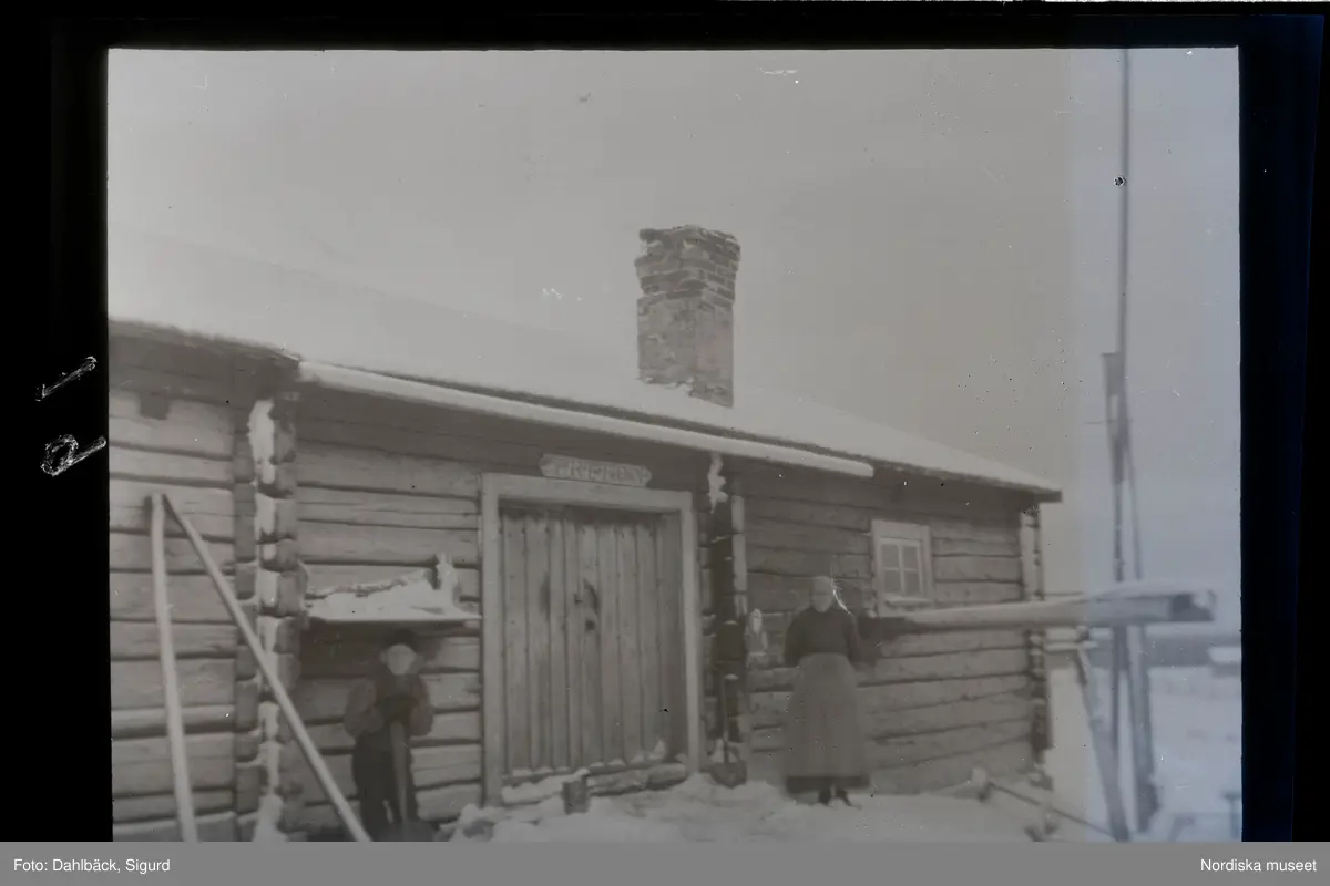 Fotografens anteckning: Dito gård (Karl Anton Holmbergs gård) "nya" ladugården, uppförd 1879 + fru J. H. (Josefina Holmström) o. son Algot H. + gårdspumpen.