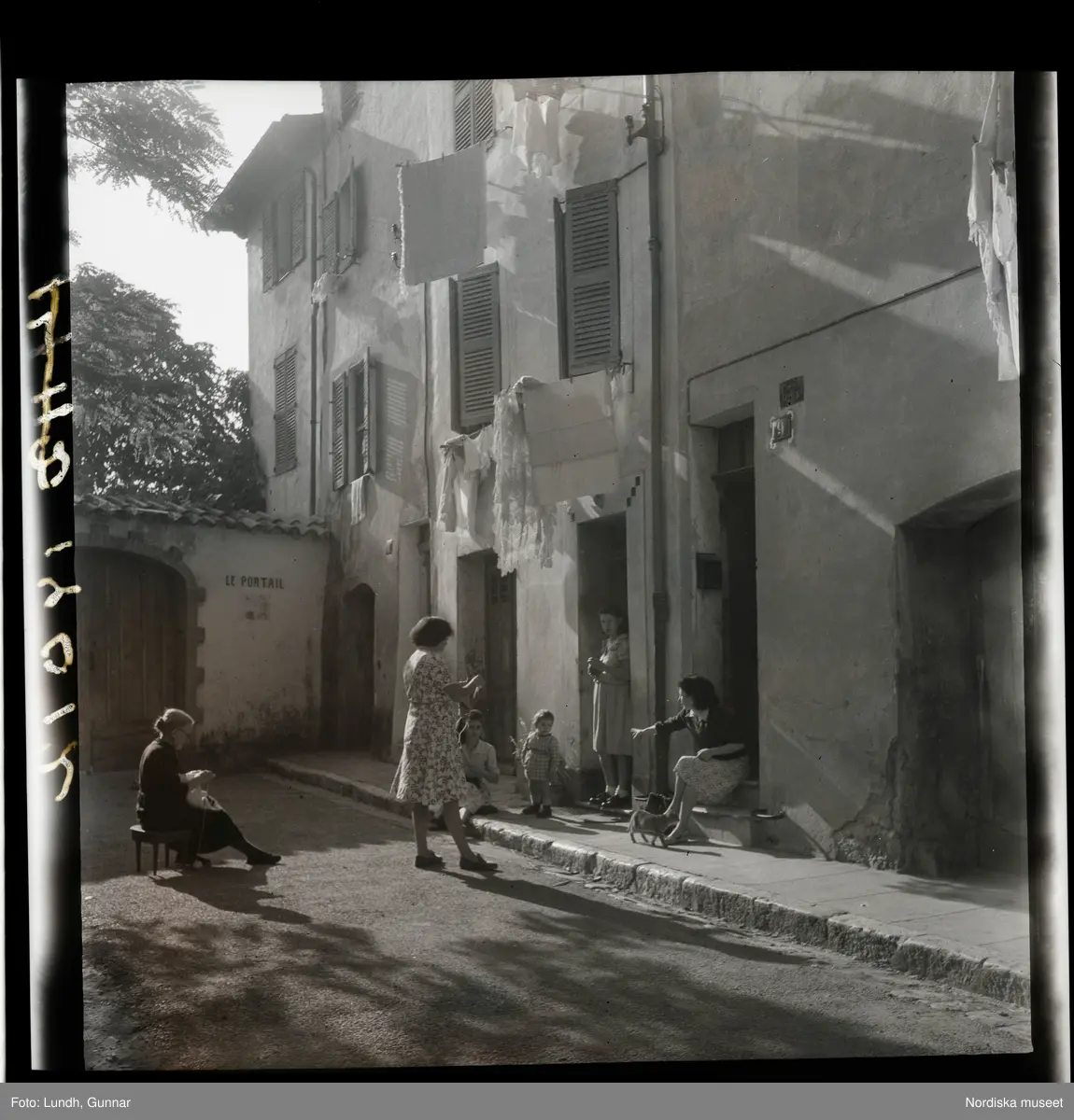 1950. Frankrike. ett barn och flera kvinnor utanföe ett hus