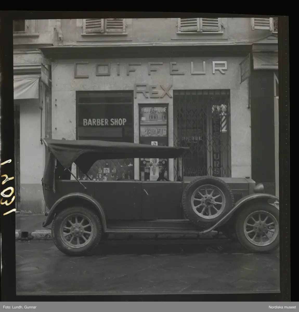 1950. Frankrike. Bil parkerad utanför en frisörlokal