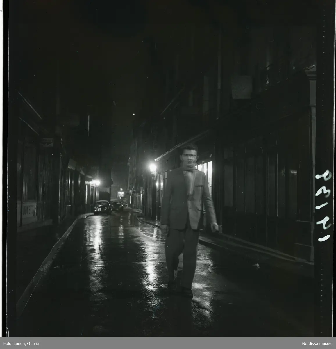 1950. Paris. "En man gåendes på gata, kvällsbild