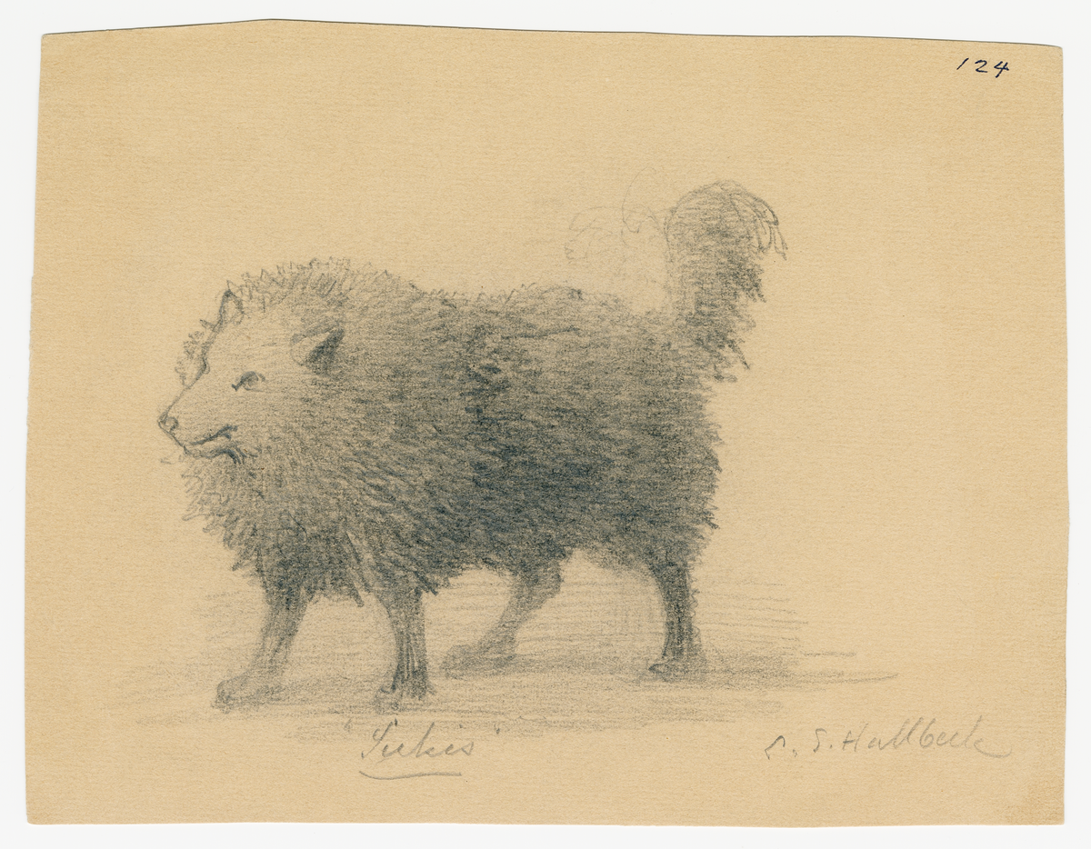 Blyertsskiss föreställande en lurvig hund. På teckningen står skrivet "Sickis", här avses sannolikt lapphunden vid namn Sickis som kommer till Nordiska museet för att avlivas då det är tänkt att hunden uppstoppad ska ingå i ett av scenerierna. Men Artur Hazelius, hans son Gunnar och kullorna som arbetar på museet blir så förtjusta i Sickis att de låter honom leva. Signerad av konstnären Carl Svante Hallbeck.