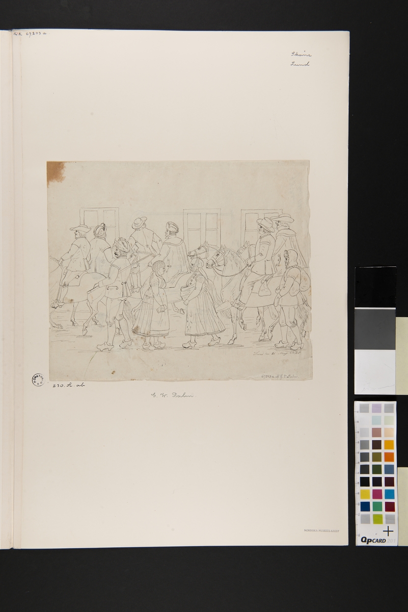 Dräkt. "Lund den 21 Mars 1826" (? sista siffran svårläst)". Fotgängare och män till häst på en väg. Tuschteckning i storformat av G.W. Palm.