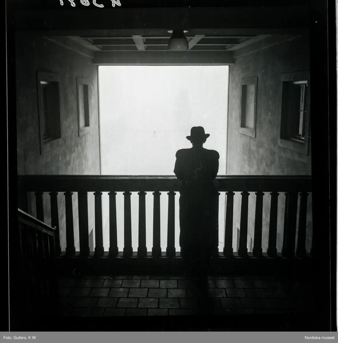 542/B Dimma. En man i hatt står vid ett räcke och tittar ut i dimman.