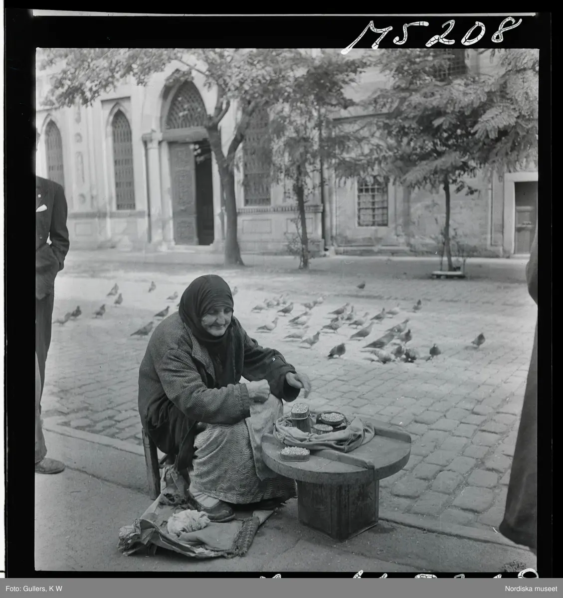 1717/L Istanbul allmänt. Gatuförsäljare. En kvinna sitter på trottoaren och säljer frön/ nötter.