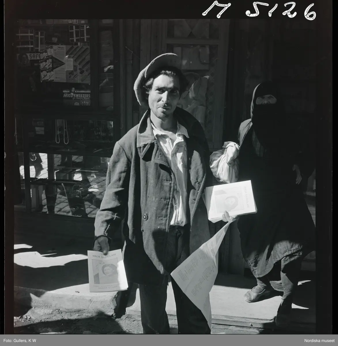 1717/K Istanbul allmänt. Gatuförsäljare. En man i stor keps säljer en trycksak.