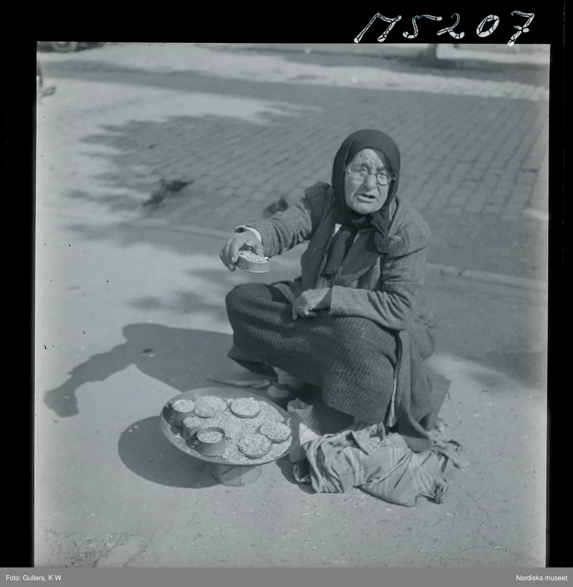 1717/K Istanbul allmänt. Gatuförsäljare. En äldre kvinna sitte rpå trottoaren och säljer något/ nötter?