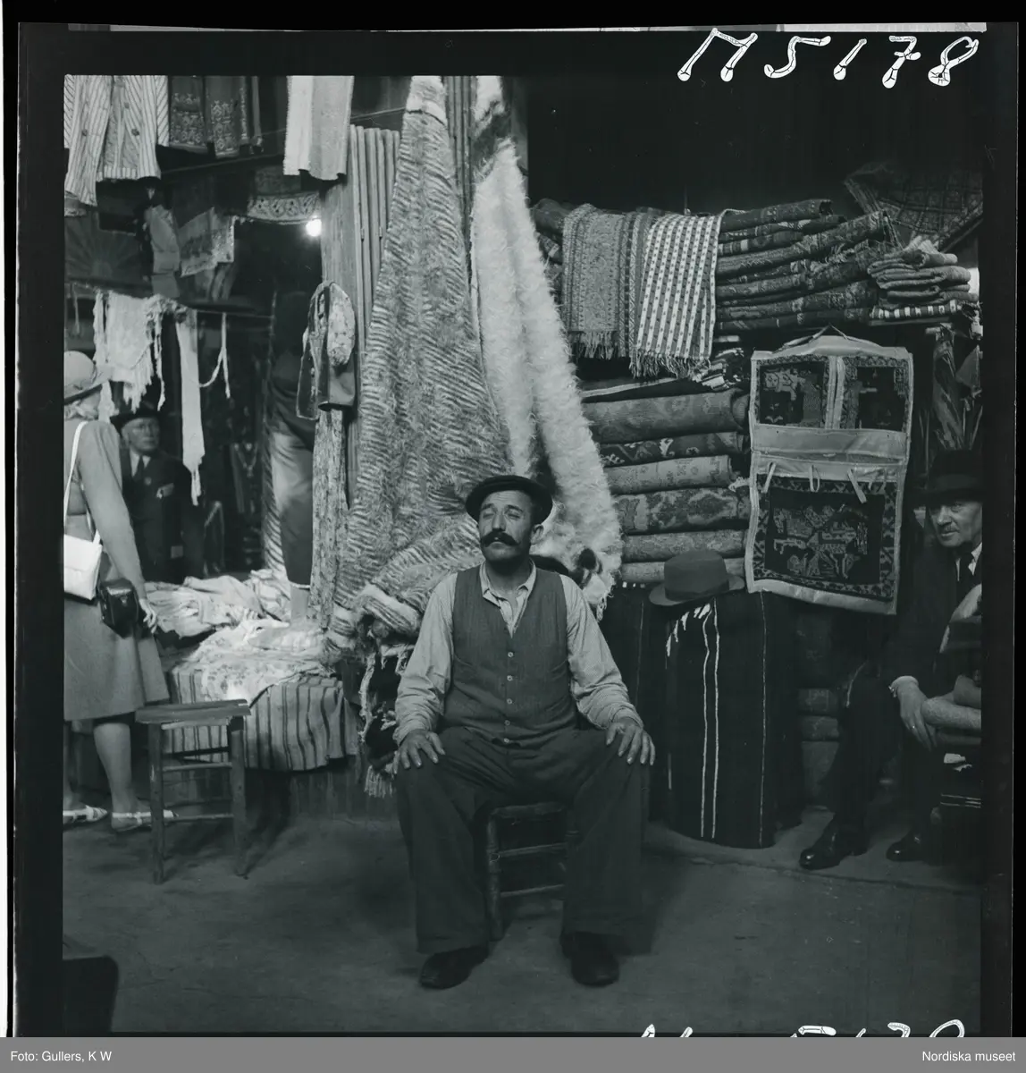 1717/K Istanbul allmänt. En man sitter framför en butik som säljer mattor, eventuellt marknaden i Grand Bazaar.