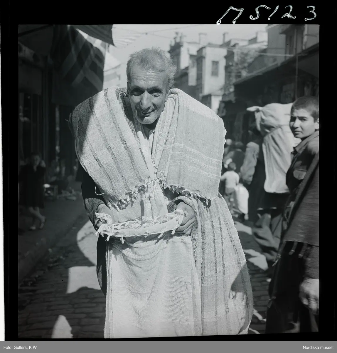 Titel: 1717/K Istanbul allmänt. Porträtt av en gatuförsäljare med hamam-handdukar över axlarna.