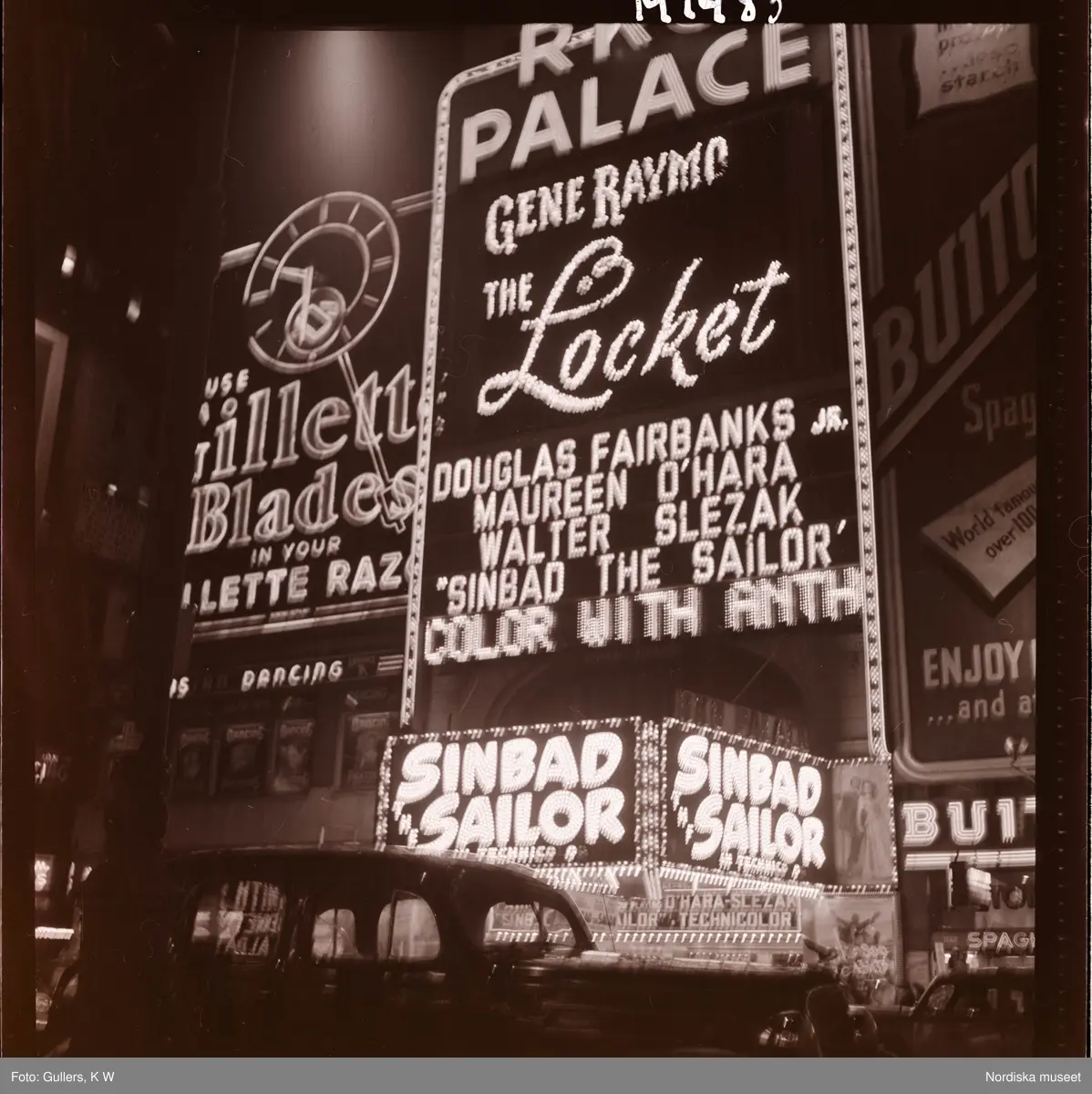 Titel: 1690 New York, allmänt. Gatubild nattetid. Neonljus, reklam.