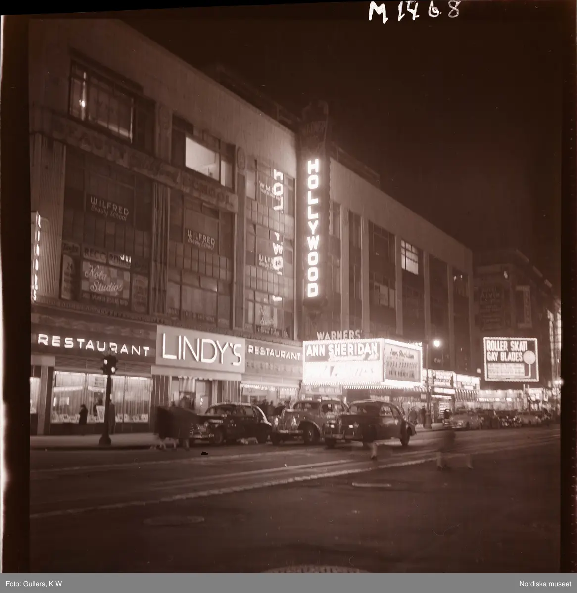 1690 New York, allmänt. Kvällsbild. Trafikerad gata, neonljus.