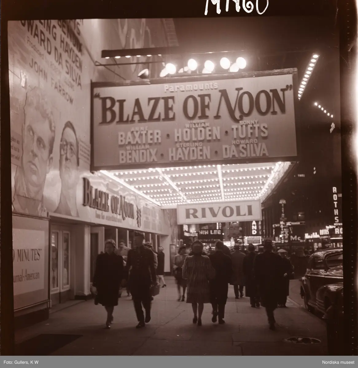 1690 New York, allmänt. Människor utanför biograf Rivoli som visar filmen "Blaze of Noon".