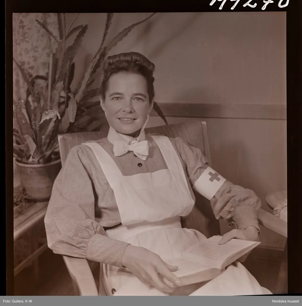 1714 En sjuksköterskas arbetsdag på södersjukhuset. Porträtt av en sköterska som sitter och läser i en bok.