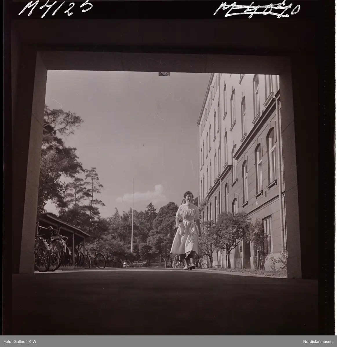 1711 En sjuksköterskas arbetsdag. En sköterska påväg in i sjukhusbyggnad.