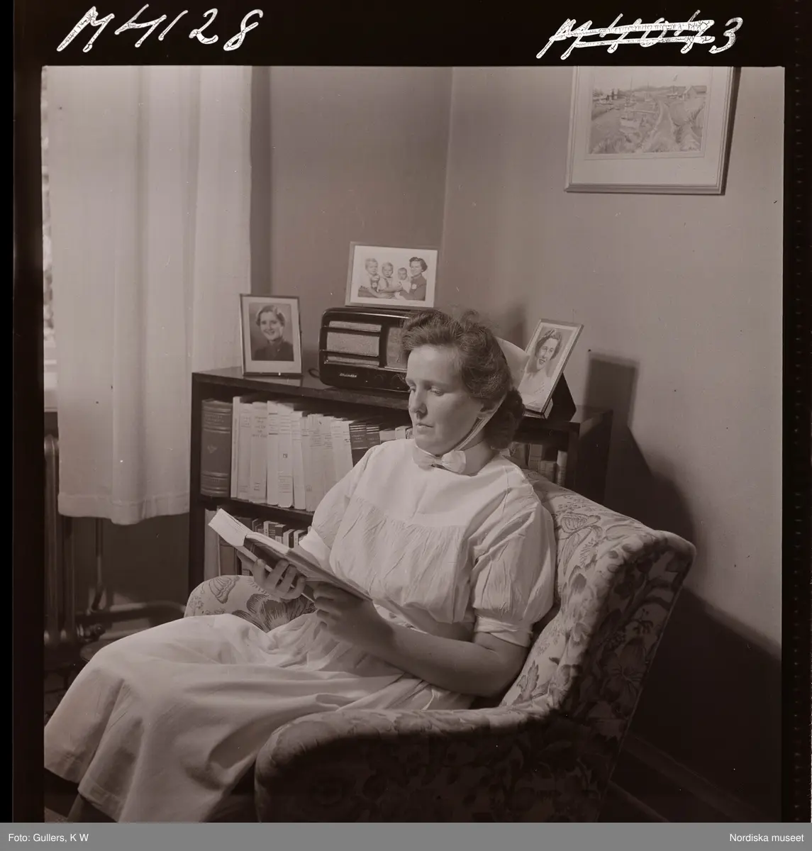 1711 En sjuksköterskas arbetsdag. En sköterska sitter och läser i en fåtölj.