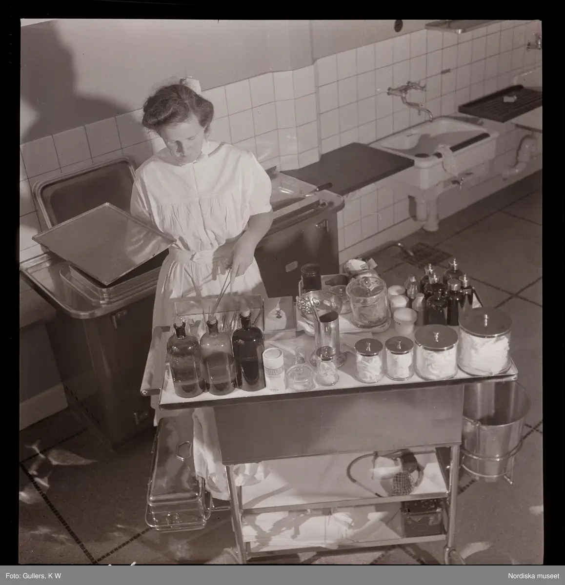 1711 En sjuksköterskas arbetsdag. En sköterska arbetar vid en vagn med redskap, vårdmaterial.