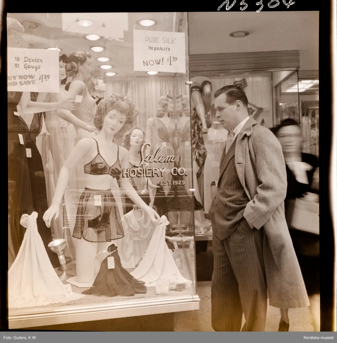 1690 New York allmänt (N.Y. Herald Tribune). En man framför ett skyltfönster. Butiken säljer damunderkläder.