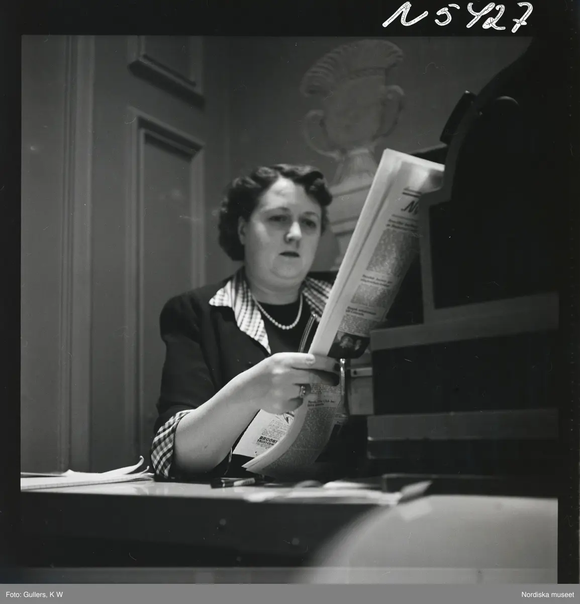 1690 New York allmänt (N.Y. Herald Tribune). En kvinna sitter vid en kassapparat och läser tidningen.