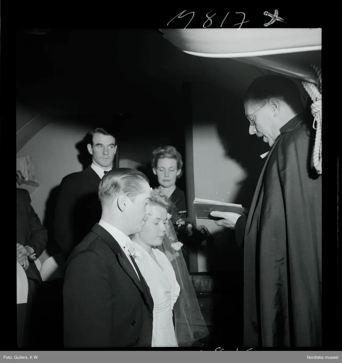 "1680 Bröllop i luften med Abas DC-4 ""Sunnan"" till Paris " Vigsel i luften. Ett brudpar står på knä framför en präst i ett flygplan.