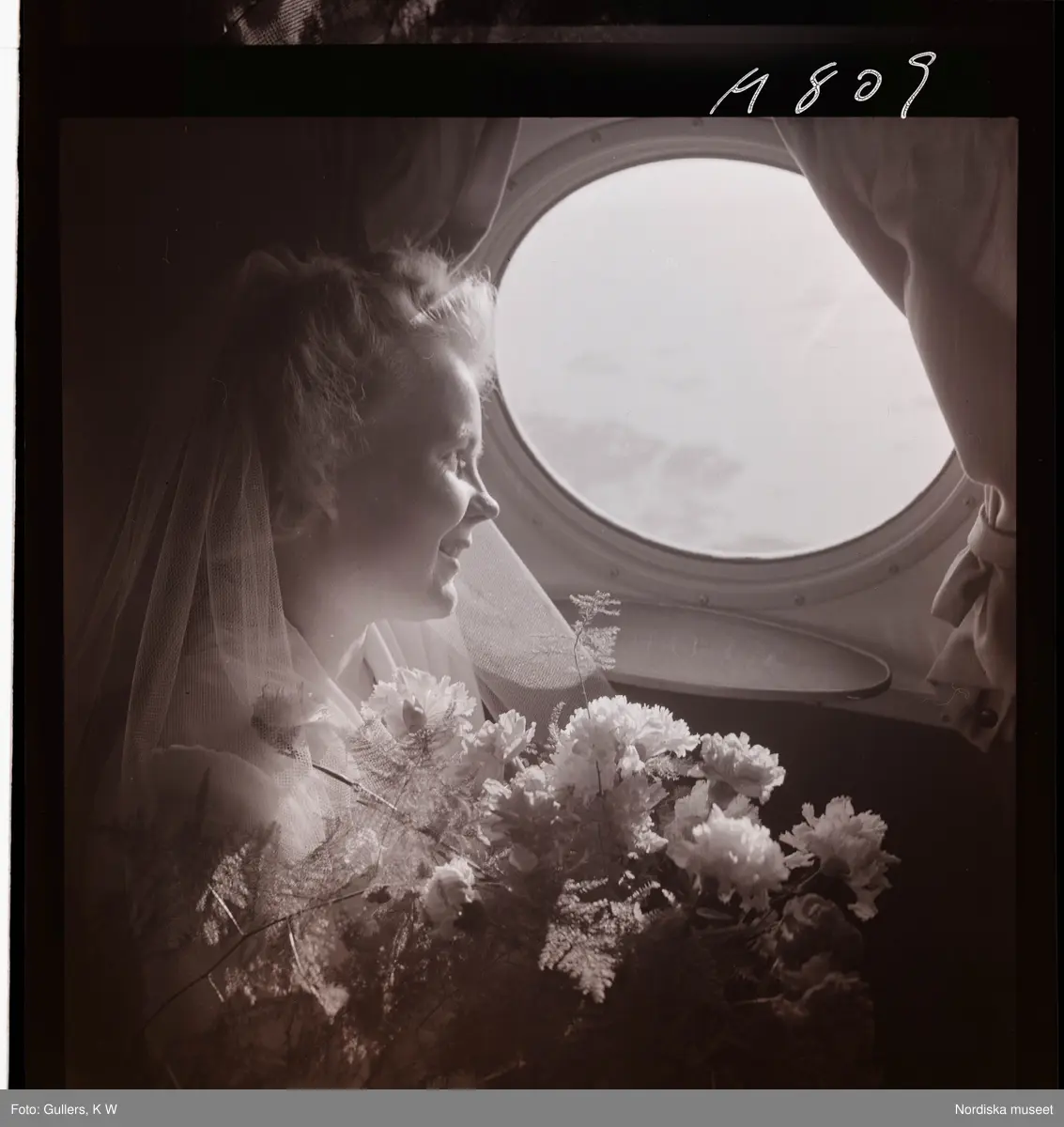 "1680 Bröllop i luften med Abas DC-4 ""Sunnan"" till Paris " Brud sitter och tittar ut genom fönstret i ett flygplan.