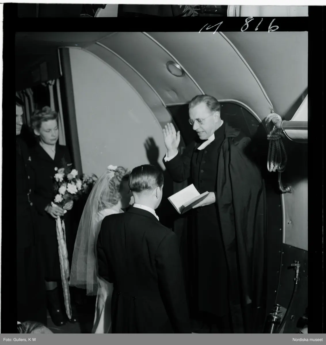 "1680 Bröllop i luften med Abas DC-4 ""Sunnan"" till Paris " Vigsel i luften. Ett brudpar välsignas av en präst.