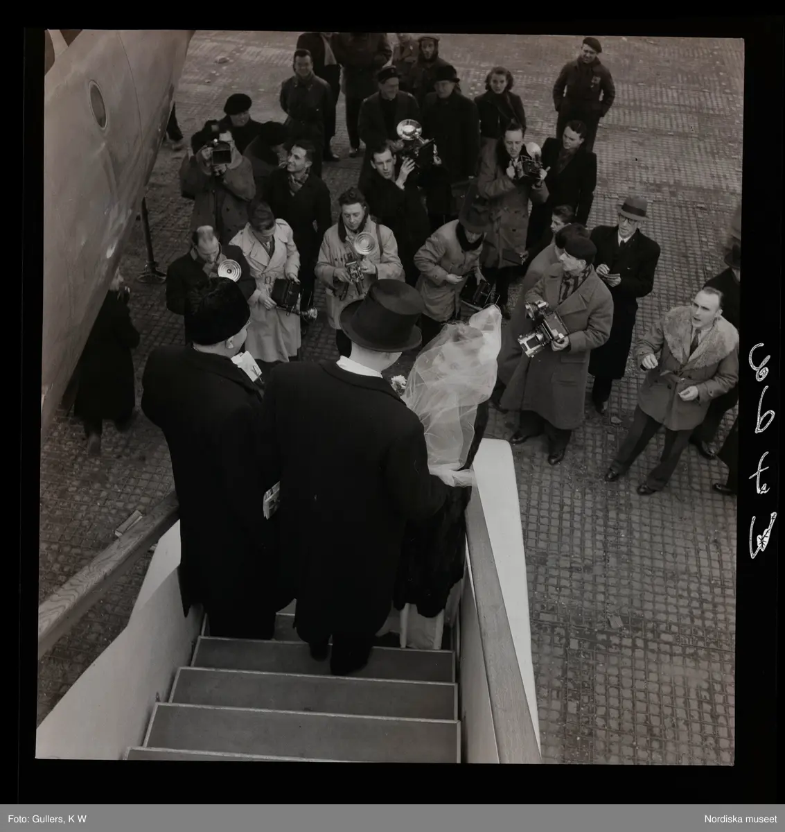 "1680 Bröllop i luften med Abas DC-4 ""Sunnan"" till Paris " Ett brudpar lämnar ett flygplan och möter fotografer på marken.