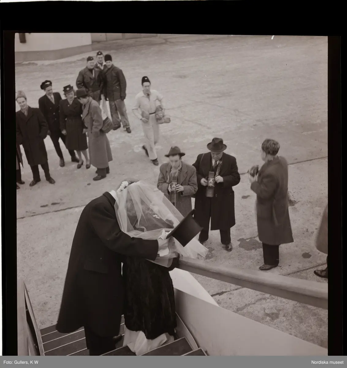 "1680 Bröllop i luften med Abas DC-4 ""Sunnan"" till Paris " Ett brudpar kysser varandra på trappan till ett flygplan. Nedanför står fotografer.