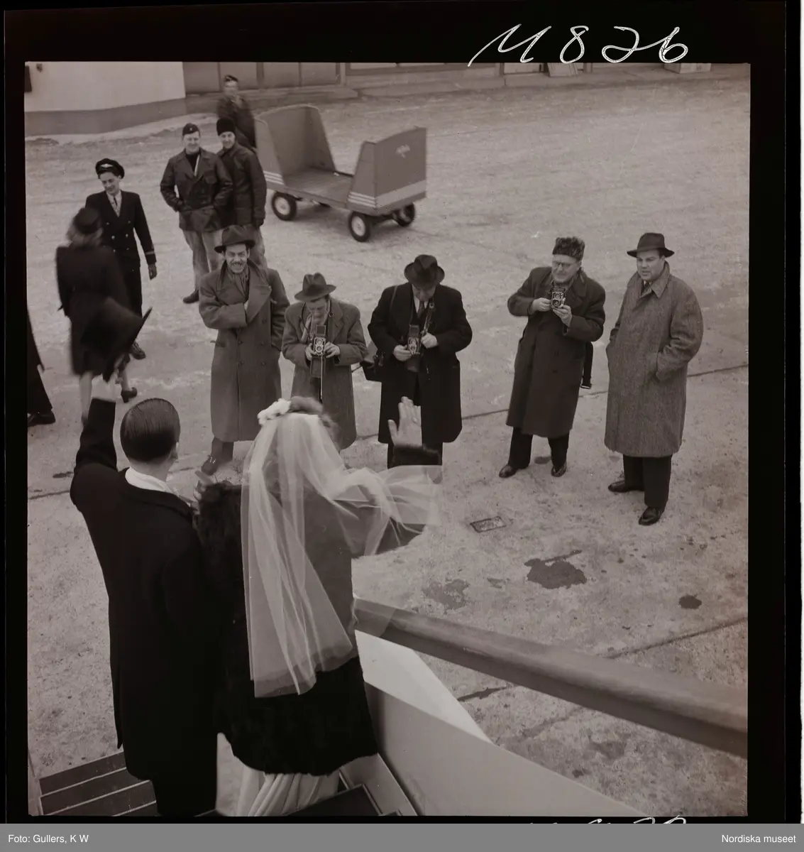 Titel: "1680 Bröllop i luften med Abas DC-4 ""Sunnan"" till Paris " Ett brudpar går nedför trappan till ett flygplan. Nedanför väntar fotografer.