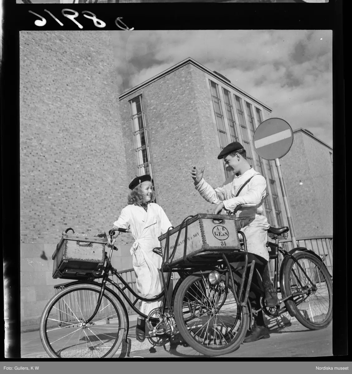 539 Söder. En ung kvinna och en ung man i arbetskläder på cyklar med lådor. På ena lådan syns texten Georg Ekström & Son.