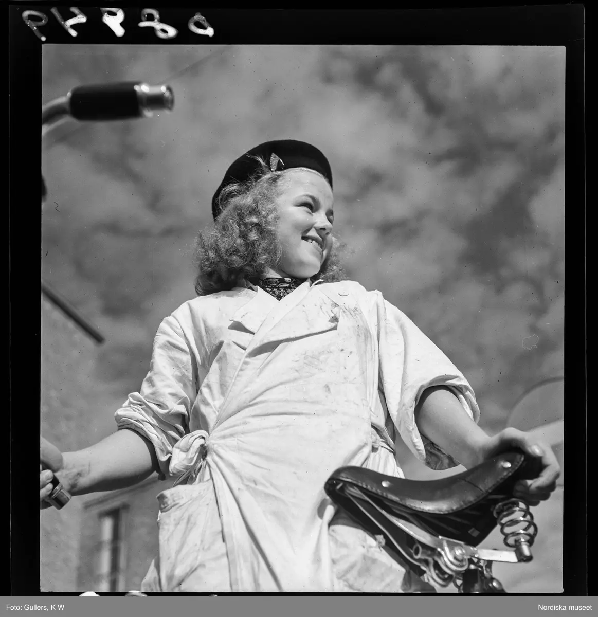 Titel:539 Söder. Ung kvinna i arbetskläder vid cykel.