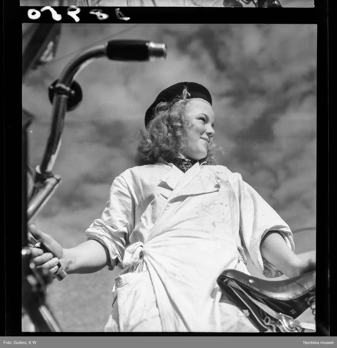 Titel:539 Söder. Ung kvinna i arbetskläder vid cykel.