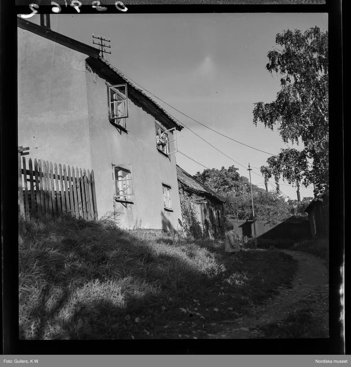 539 Söder. En kvinna tvättar fönstren i ett äldre hus. En liten flicka står i gräset nedanför.