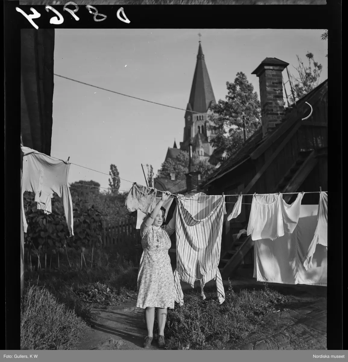 539 Söder. En kvinna hänger tvätt framför en av träkåkarna i Vitabergsparken.