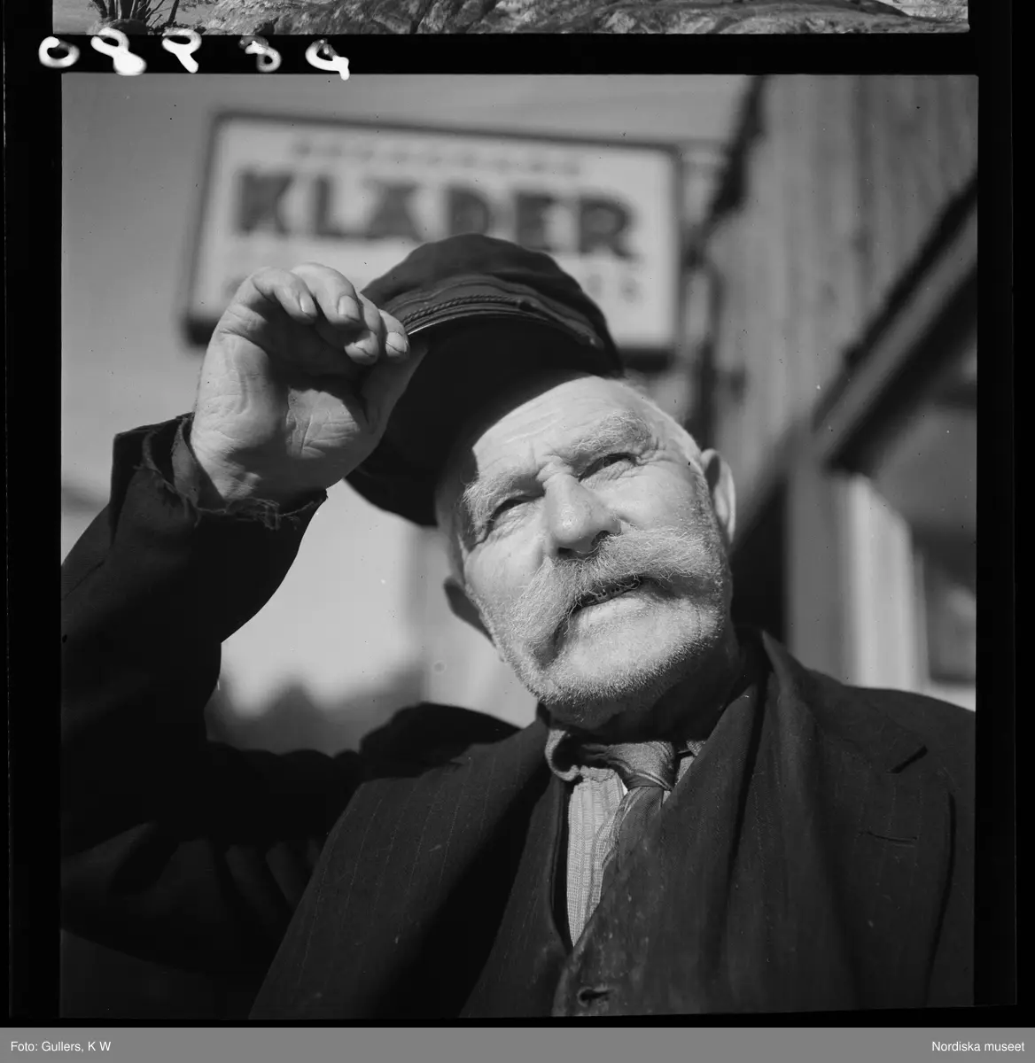 539 Söder. Porträtt av en man i mustasch som lyfter på kepsen.