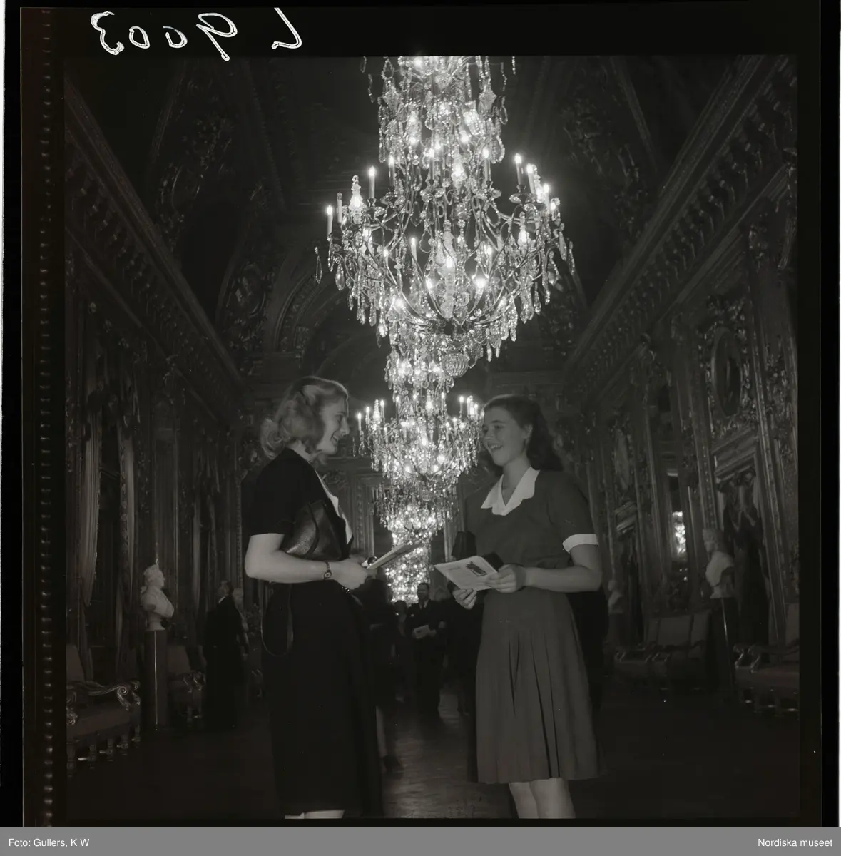 561 Operan för Allers. Två unga kvinnor står under ljuskronorna i foajén.