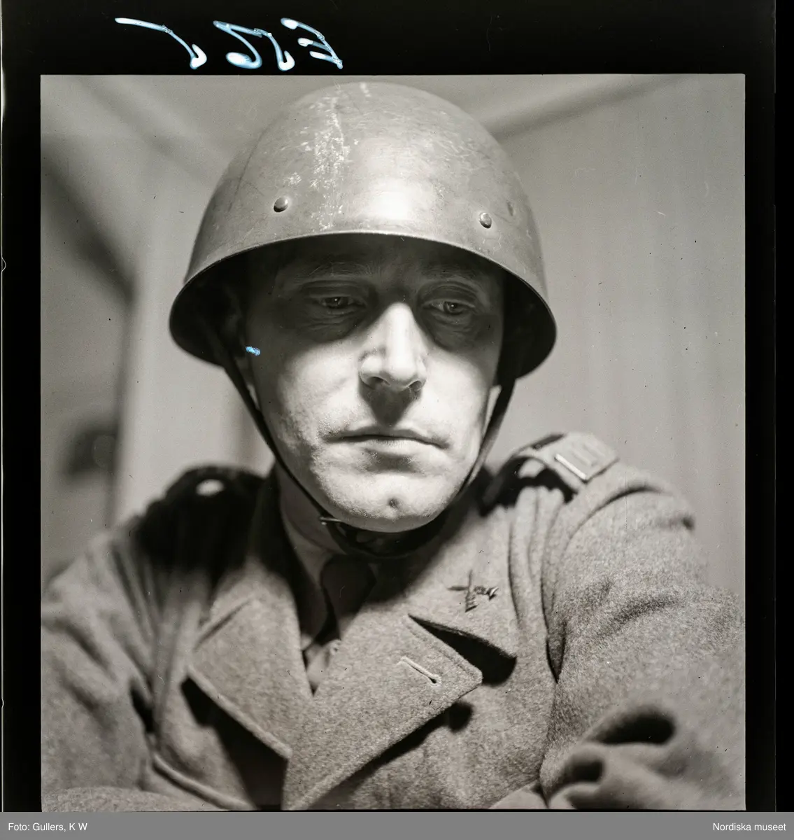 581 Bokomslag militärt. Porträtt av militär i uniform, hjälm.
