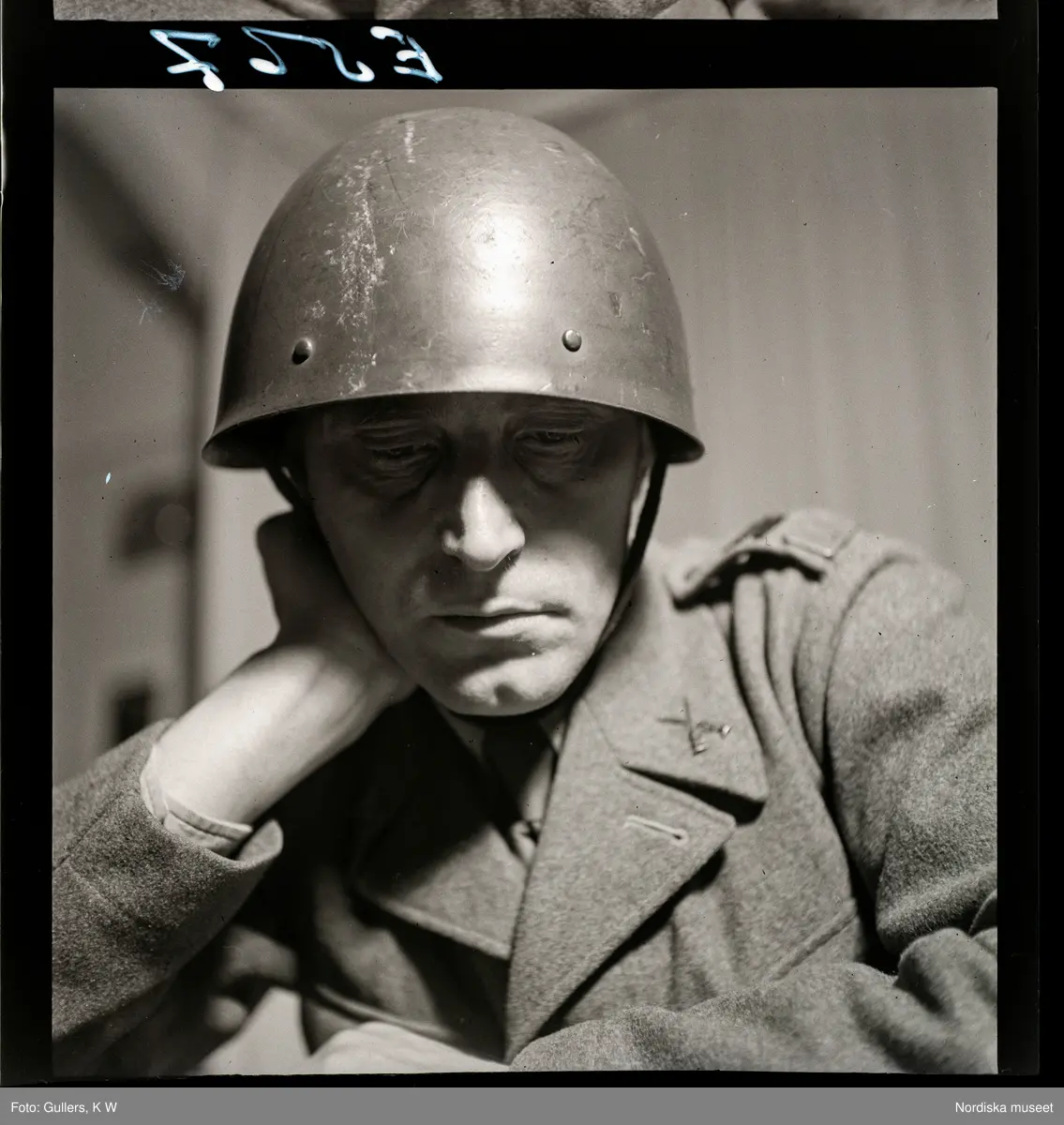 581 Bokomslag militärt. Porträtt av militär i uniform, hjälm.