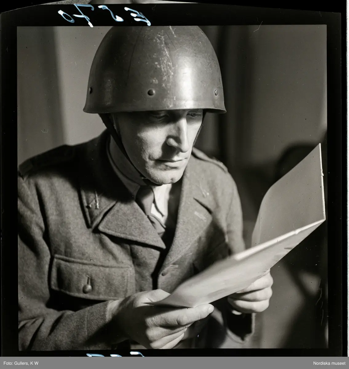 581 Bokomslag militärt. Porträtt av militär i uniform som läser.